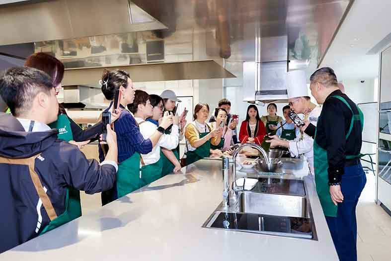 亚洲点心天王陈世辉博士现场演绎“曼烹细煮”健康烹饪哲学,带领12组企业家组成的团队成员一起完成少油粽子和低温牛排教学,传递“厨房即疗愈空间”的理念。